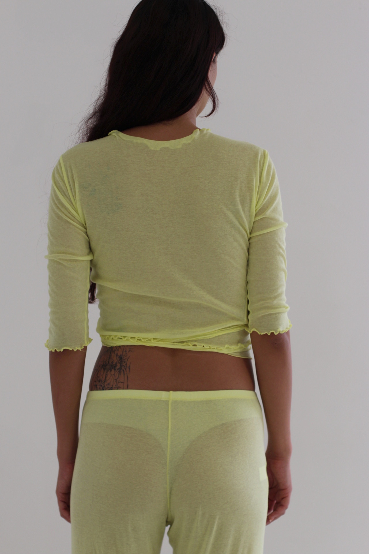 A lightweight, semi-sheer wrap-around top made from 100% cotton. Designed for versatile styling with an adjustable tie and a pearl button detail. Offered in three colors and designed to be worn on its own or with the matching bottoms.